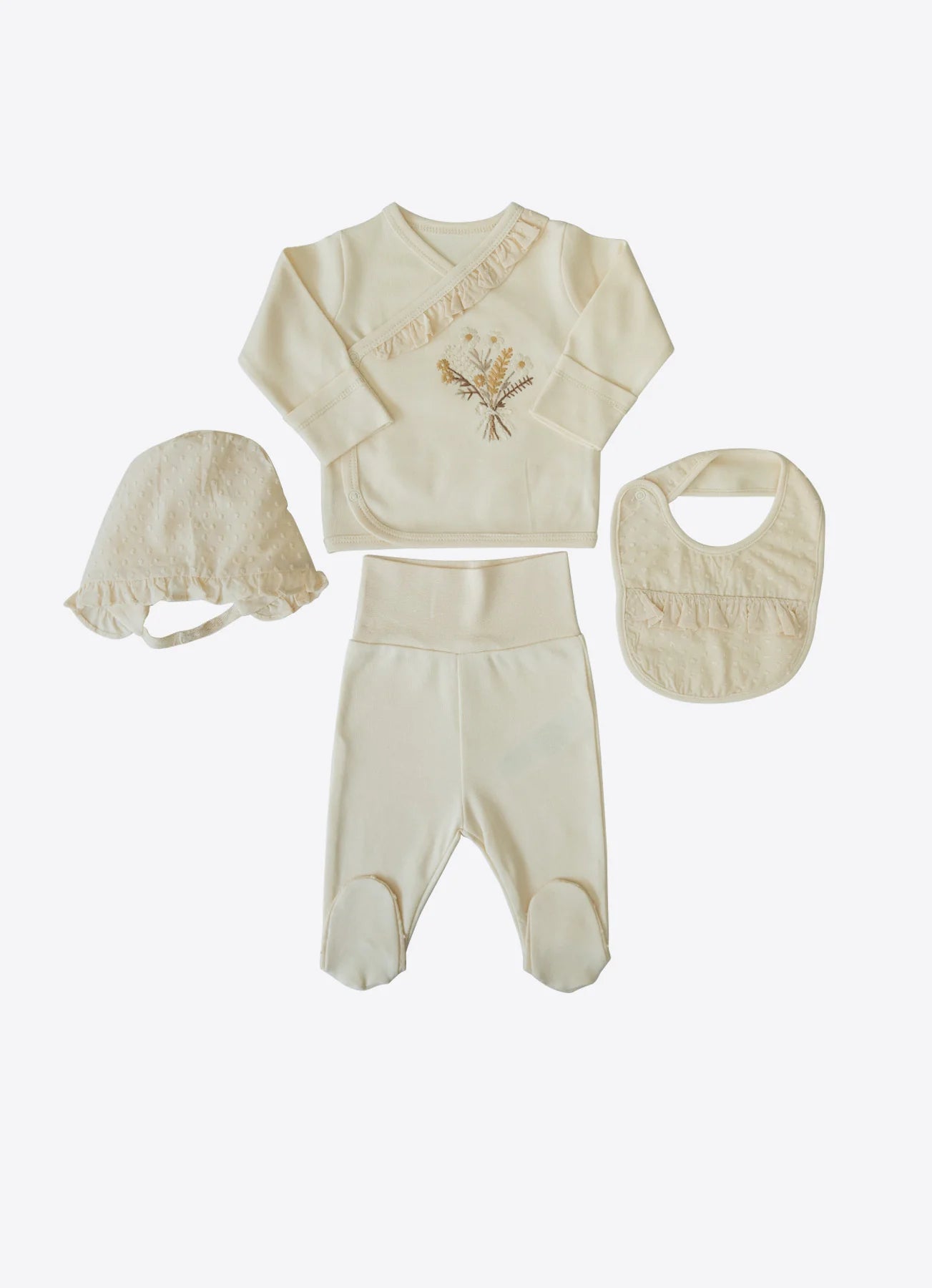 Dette nydelige nyfødtsettet i fire deler er laget av myk og pustende økologisk bomull – skånsomt for babyens sensitive hud og trygt for fremtiden. Perfekt som gave til nybakte foreldre eller som en del av babyens første garderobe.