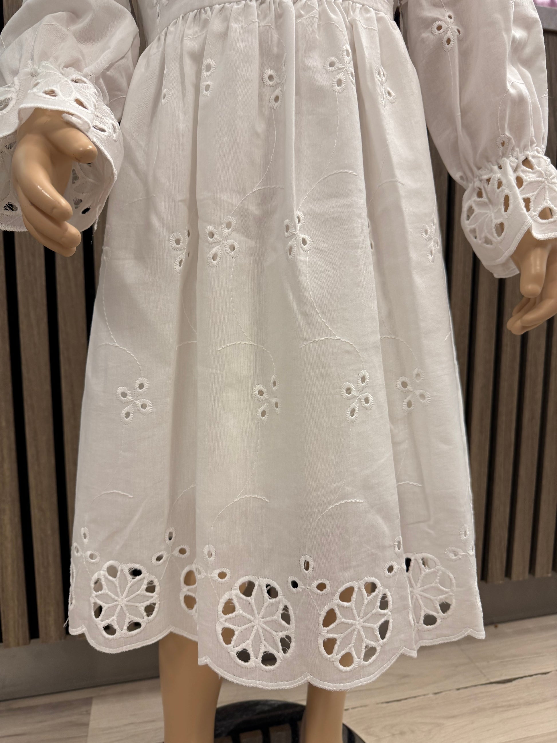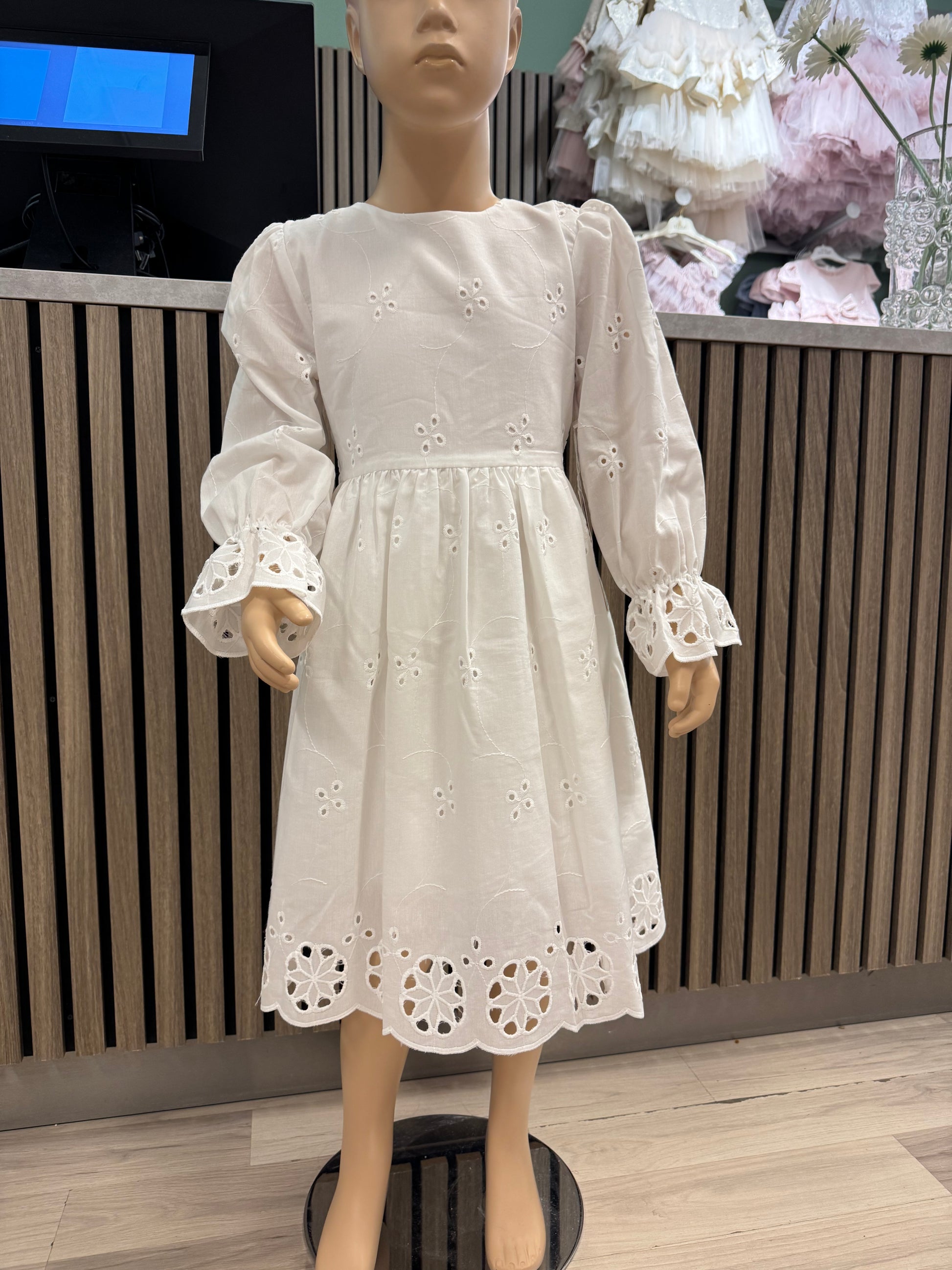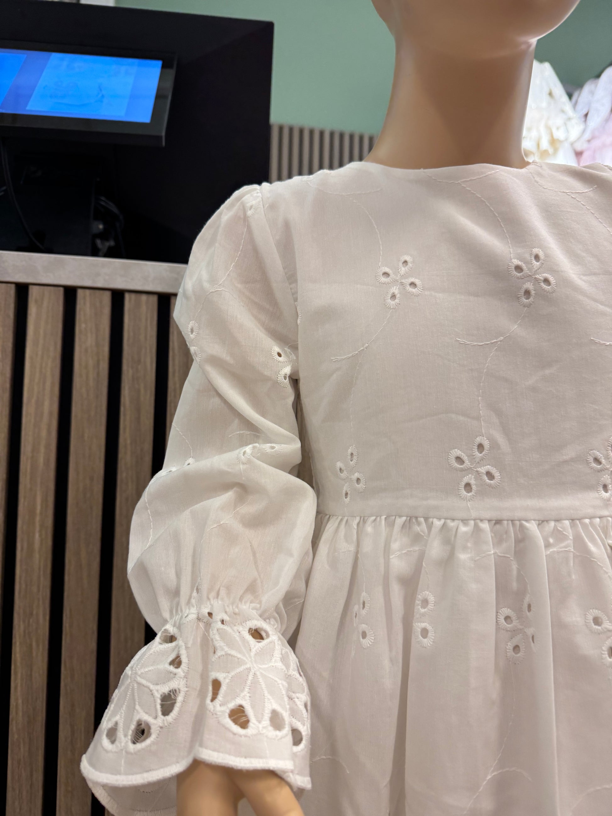 En nydelig hvit kjole Kjolen har lange ermer med delikate detaljer – perfekt for spesielle anledninger eller når det lille ekstra trengs i hverdagen.